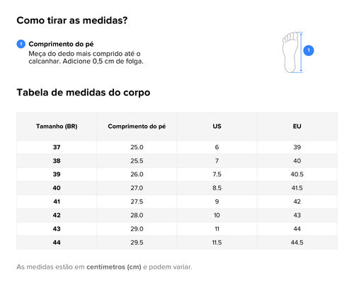 Forma Padrão Nº 37 – 25 cm Nº 38 – 25,5 cm Nº 39 – 26 cm Nº 40 – 26,6 cm Nº 41 – 27 cm Nº 42 – 28 cm Nº 43 – 29 cm Nº 44 – 29,5 cm Garantia: 30 Dias Para Defeito de Fábrica